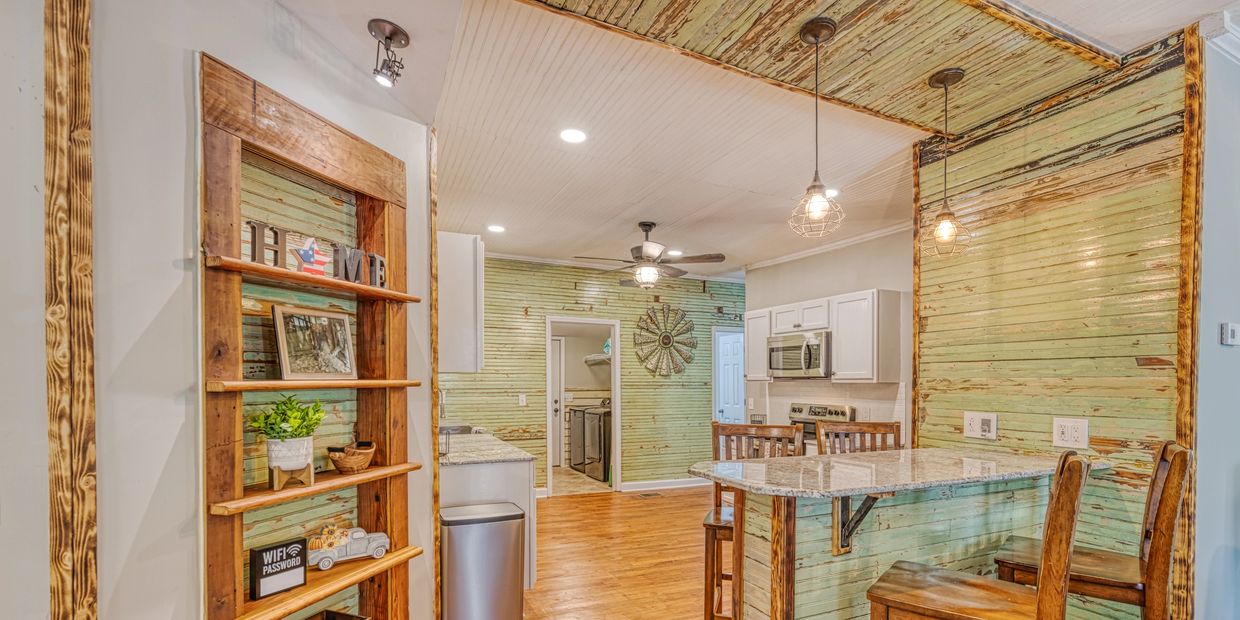 Reclaimed beadboard, eat in bar with wireless phone charger.